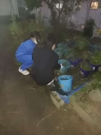 稲の処理は、濡れた状態ではうまく進まず、雨も降ってきたので、バケツに溜まった水をある程度抜いて、これ以上水が溜まらないように、バケツを屋内に移動させて、本日の作業を終えました。