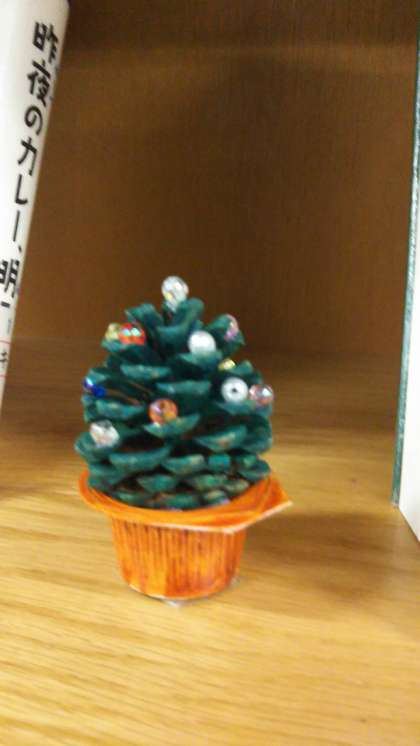 図書館支援員さんの提案で、小さなクリスマスツリーを作り飾っています。