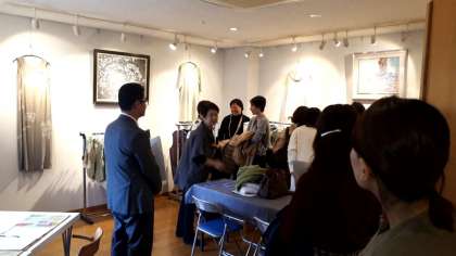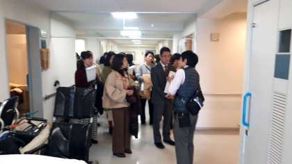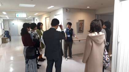 スタッフの方々のご案内で、各フロアの施設の役割や利用状況について、ご説明していただいています。皆さん、熱心に聞かれています。