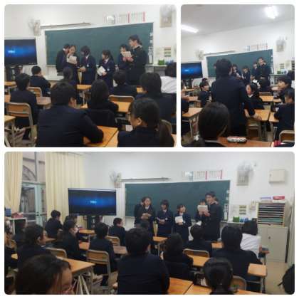 今日は生徒会役員とESS部が小学校に訪問して、学校紹介をしています。開平小学校の6年生のみんなも真剣に聞いてくれました。生徒会からは1年間の学校生活についての説明をし、友達の大切さ、学習面のアドバイス、部活動の意義について話をしました。