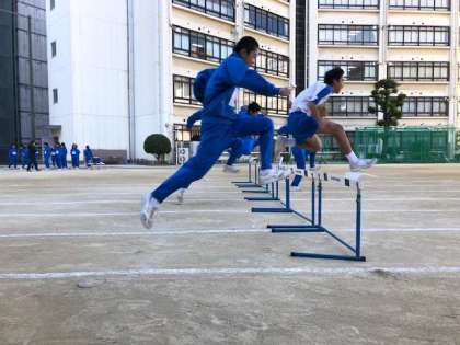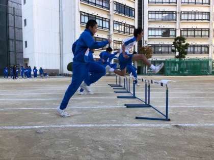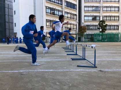 寒さが増した朝ですが、2年生1・2組はグラウンドで元気にハードル走と走り幅跳びに取り組んでいます。