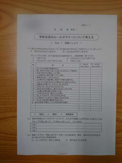 学校生活のルールやマナーについて考えていきました。毎日の生活のなかで、チャイムの合図や時間を守っていますか?みんなで使う物や場所を大切にしていますか?