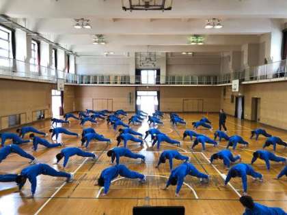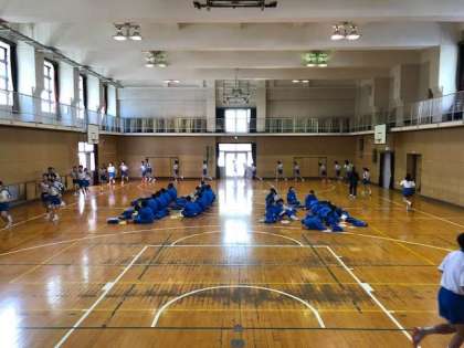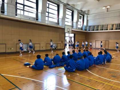 今日はグラウンドのコンディションが悪く体育館で6分間走にチャレンジしています。ペアをつくってお互いに走る人と計測やアドバイスをする人にわかれて授業を進めています。
