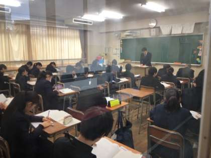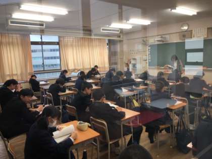 先生が読んでいる声にしっかりと耳を傾けて一緒に教科書に目を通しています。