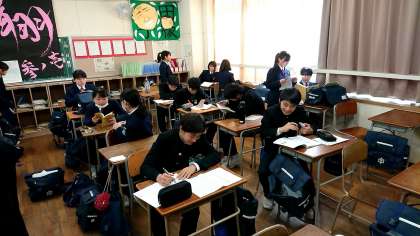 今日の昼休みの様子は少し違います。最後の社会科のテストに向けて、参考書や教科書・ノートを開いて勉強する者、問題を出しあって答える姿が見られます。32期生のみなさん、あと1教科頑張ってください!