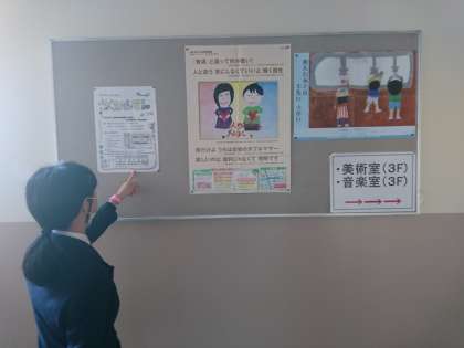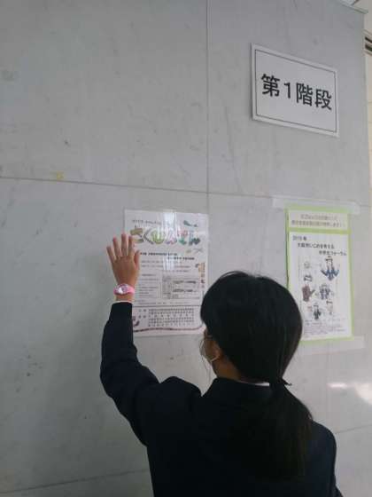 作品展のポスターを校内に掲示しました。生徒のみんながよく通る場所はどこかを一緒考えて、ポスターの掲示場所を変更しました。