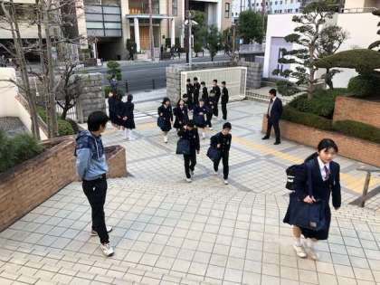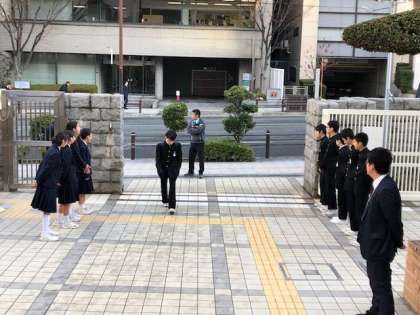 天気の良い朝です。今日も部活動の部長が朝のあいさつ活動に取り組んでいます。その姿を見て元気にあいさつをして校門を通過する東中生も増えてきました。