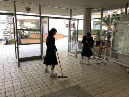 校内ではソフトテニス部が朝の清掃活動に黙々と取り組んでいます。今日も頑張れ東中生!