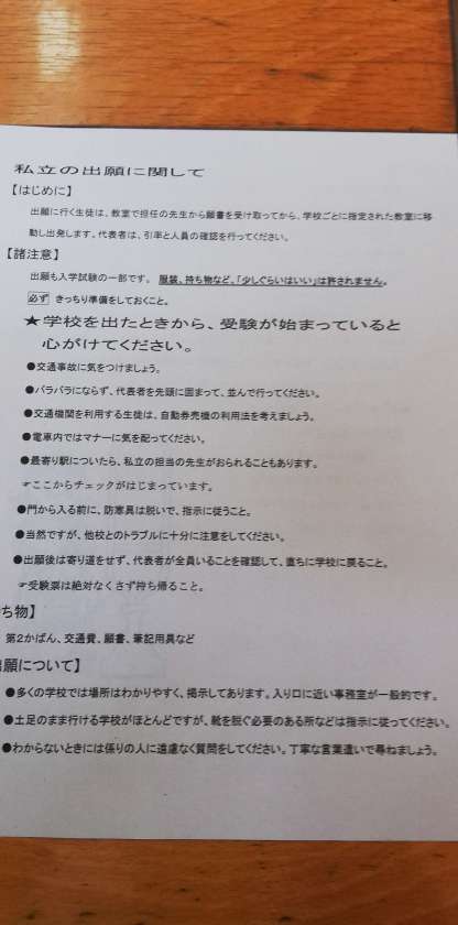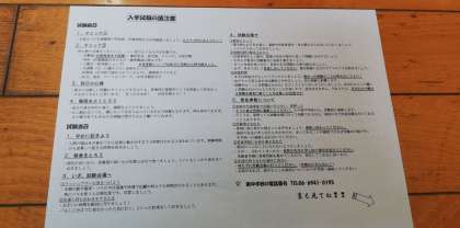 生徒に配布されたプリントです。出願についてと入学試験についての諸注意です。家でも必ず読んでください。