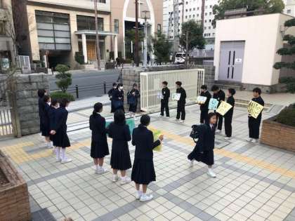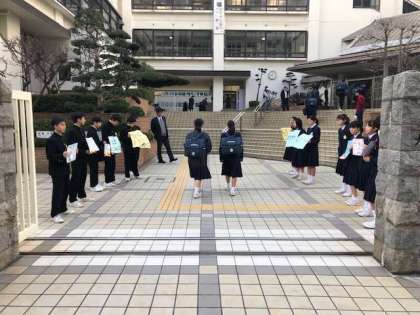 生徒会役員と部活動の部長さんたちがあいさつ活動を行っています。東中生1人ひとりが大きな声であいさつをできる人になることが活動の目標です。