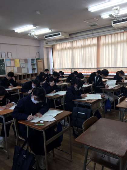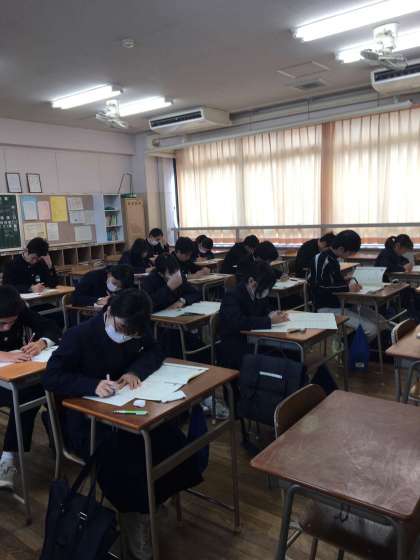 本日9時より、東中学校にて、2019年度第3回英検の一次試験を実施しています。3月に行われる公立高校の一般入学者選抜において、英検2級取得者は、英語の得点の8割を保証されるという優遇措置を受けられることを考え、今回は2級のみの実施です。2級は高校卒業程度の内容なので、かなり難しいのですが、3年生12名、2年生4名、1年生1名の合計17名が受験しています。一次試験を突破すると、二次の面接試験に挑戦します。筆記85分、リスニング24分の長時間にわたる試験ですが、みんな真剣に取り組んでいます。合格目指してがんばれ!