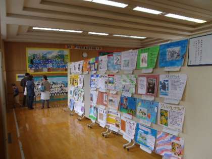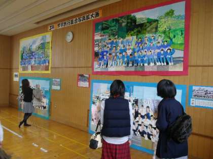 多目的室での美術科の生徒作品展示です。毎年好評の修学旅行での集合写真をモチーフにした作品が目を引きました。先生の表情に喝采です。
