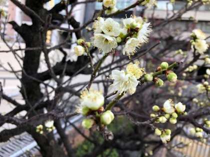 冬が極まり春の気配が立ち始める日。東中学校の正門横の白梅も、昨日の寒紅梅に続いて花が咲きました。