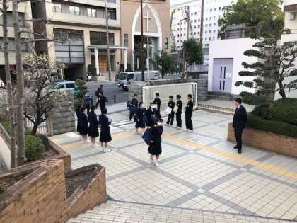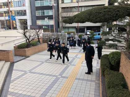 少し寒さを感じますが、良い天気の朝です。今日も部活動の部長たちが元気にあいさつ活動に取り組んでいます。