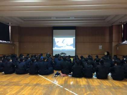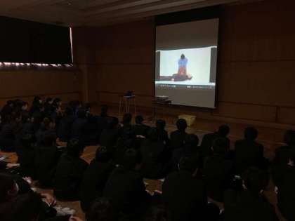 2時間目、2年1・2組の保健体育も救急救命についてDVDで視聴学習をしています。