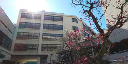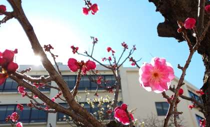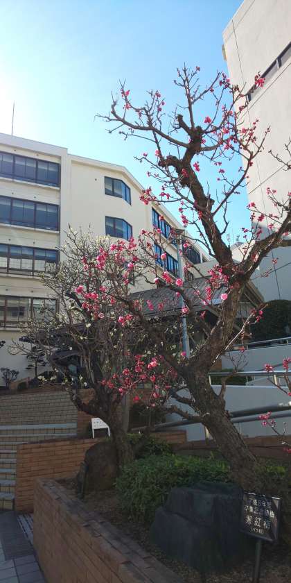 東中正門の卒業記念樹の寒紅梅がひとつ、またひとつと開花し始めています。
