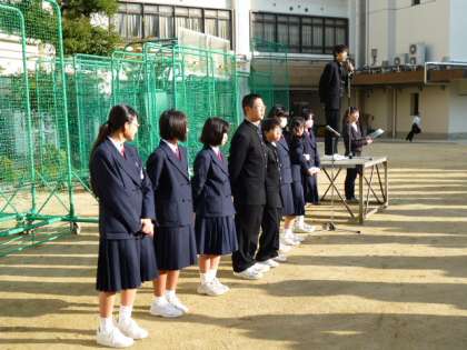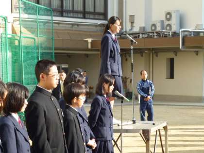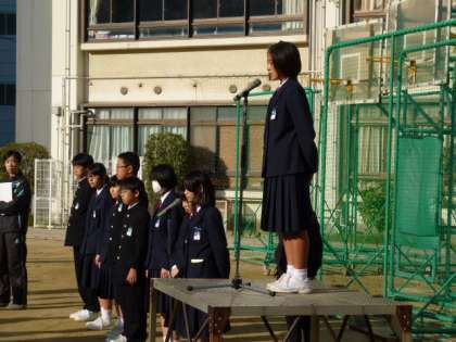 表彰状の伝達式に続いて、昨日の常置委員会を受けて、美化委員会と保健委員会から話がありました。美化委員会からは、今日と明日に美化点検を行うので目標として、「トイレの鏡のよごれが目立つことから隅々まで清掃をきっちりとしましょう。」でした。