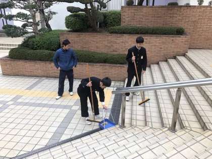 ソフトテニス部やサッカー部が朝の清掃活動に取り組んでいます。元気な学校、美しい学校、今日も頑張れ東中生!