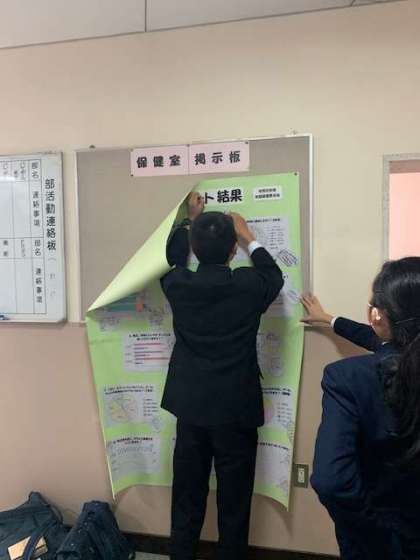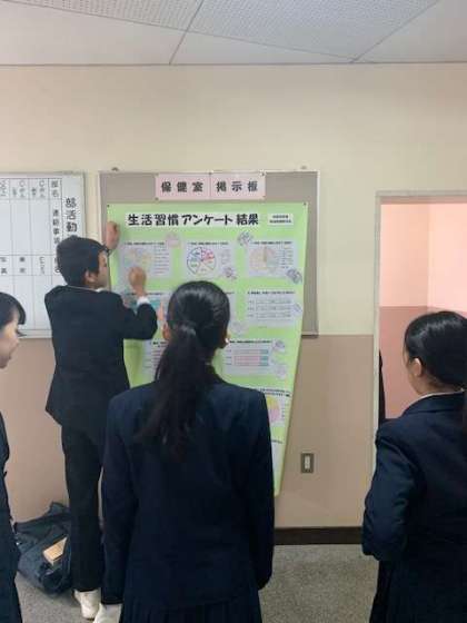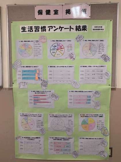 生活習慣アンケートの結果を保健委員がまとめ、保健室掲示板に掲示しました。グラフは見やすくレイアウトされ、結果から読みとれるコメントも作成しています。ぜひご覧ください!