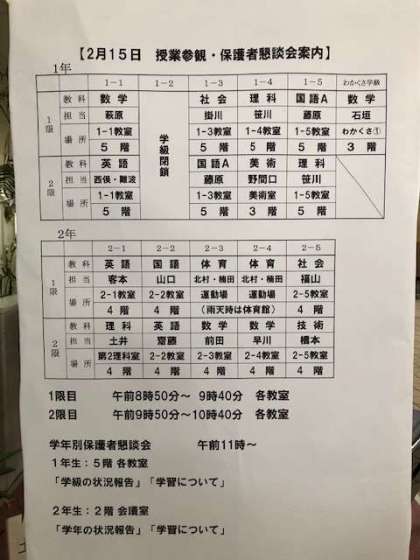 本日、1・2年生は授業参観と保護者懇談会が予定されています。よろしくお願い申し上げます。