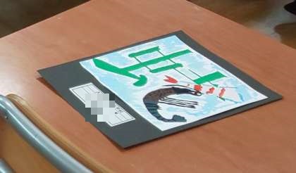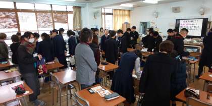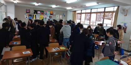 授業生徒、小学生、保護者のみなさんが全生徒の作品を見て回っています。