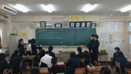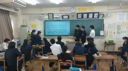 1番目の発表班が前に並ぶと、自然に拍手がおき、静かに発表を聞いていました。班で発表内容の分担をして、それぞれが役割を果たしました。