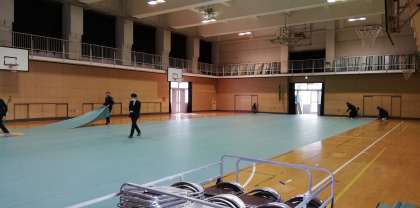 臨時休業が続く中、生徒のいない東中体育館では、今週末3月13日卒業証書授与式に向けた準備が教職員により行わ