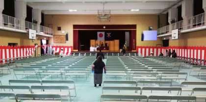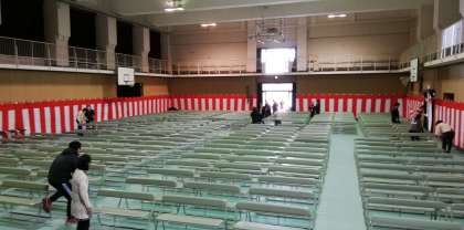 座席の設置、紅白幕の設置、舞台上の設営等、教職員一丸となって準備しました。