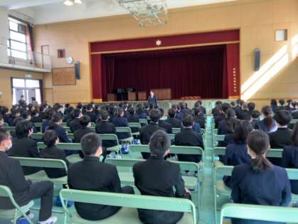 校長先生のお話では、新型ウイルスコロナの感染予防対策で2月29日から臨時休校となり、1年生の最後を締めくくる1月間が無くなりました。しかし、今日を無事に迎え、4月から2年生となり、新たなスタートをスムーズきるために、今日を節目に自分で考え、自分の行動に責任を持ち、自分の成長は自分の努力、これからの自分は自分で創るという気概をもって、今日から改めて気持ちを引き締めて、春休みを過ごしてほしいというお話と卒業証書授与式で、代表生徒が披露した答辞から、在校生へのメッセージ、32期生が過ごした東中での3年間の思い、築き上げてきた財産について、校長先生から伝えていただきました。誇りを胸に受け継げ東!まさにこれからは第34期生が繋いでいきます!