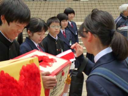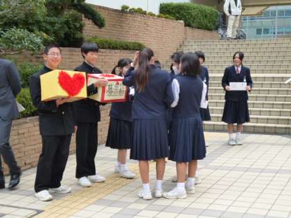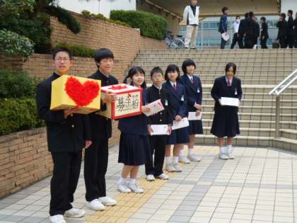 「やさしい心をあなたのまちへ」をキャッチフレーズに「赤い羽根共同募金」に今年も生徒会が取り組んでいます。