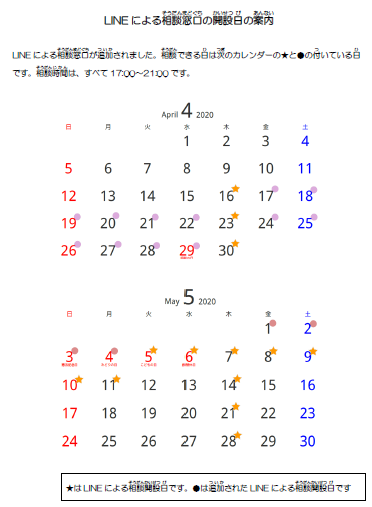 LINEによる相談窓口が追加されました。相談できる日は上記カレンダーの★と●の付いている日です。相談時間は、すべて17:00〜21:00です。