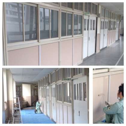 本校職員が、本館5階の1年生教室前の壁と腰板の塗装に取り組んでいます。5月7日(木)の学校再開を願い、日々のルーチンワークに加えて、黙々と作業を進めています。