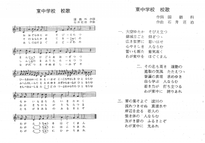 さて、校歌の3番の歌詞「♪葦の葉そよぐ 淀川の♪流れつきせね 真清水や♪岸辺を走る 若人の♪強き体の 人ならむ♪友がき皆の ふるさとぞ♪わが東中に 光あれ♪」にある淀川は、天満橋のかかる大川(旧淀川)のことでしょうか。河川敷を走る若人の姿が歌われています。校歌の1番では大阪城、2番では適塾、そして、3番では淀川(