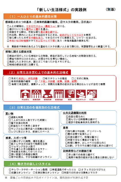 今日の記事の写真は、「新型コロナウィルス感染症対策専門家会議」が5月4日に、現状の分析を行い、分析した結果をまとめた「分析・提言」公表資料の一部で、報道でも取り上げられている「『新しい生活様式』の実践例」です(オリジナルは、ここをクリックし、9ページ(別添)をご覧ください)。