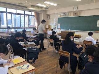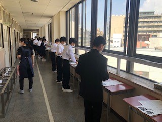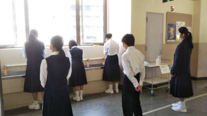 5階の1年生のフロアに上がってもう一度手洗いをしたあと、課題の提出、配布物の確認を行っています。