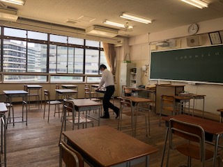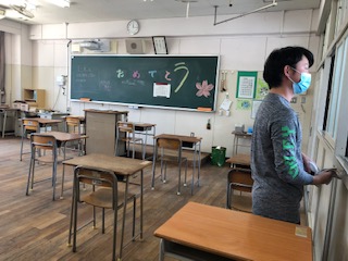B班を見送ったあとも、先生方全員で力を合わせて消毒しました。午後からC班の皆さんとお会いできるのを楽しみにしています。