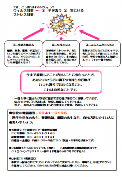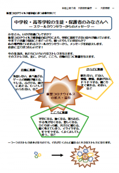 スクールカウンセラー(SC)からのメッセージが届きました。これは、大阪市教育委員会が、大阪府教育庁から関係資料の提供を受け、大阪市版に作成したものです(こちらをクリックするとルビのあるメッセージを見ることができます)。