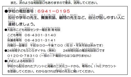 スクールカウンセラー(SC)からのメッセージを再掲します。これは、大阪市教育委員会が、大阪府教育庁から関係資料の提供を受け、大阪市版に作成したものです(こちらをクリックするとメッセージの全文をご覧いただけます)。