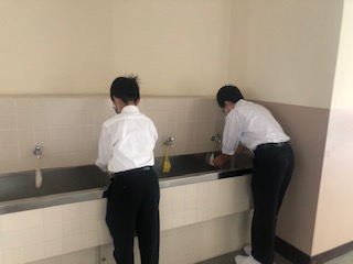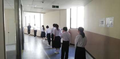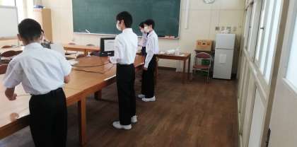 クラスで健康観察を行った後、もう一度手洗いを済ませて、聴力検査を行っています。