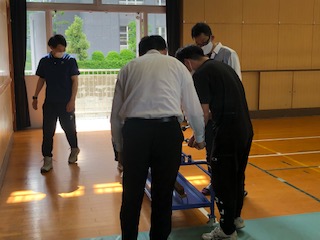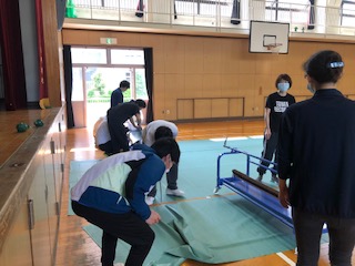 4月3日に入学式を挙行し、その後の臨時休業中は、教科書や教材の配付等で活用してきた体育館。その体育館を学校再開の決定を受け、月曜日には長椅子の片付けとシートのふき掃除。そして、今日は朝からシートの巻取とフロアのモップ掛けをして、片付けが終了。教職員は、6月1日からの学校再開に向けて準備を進めています。