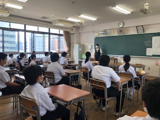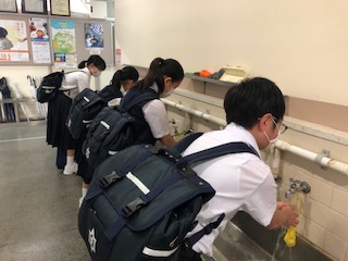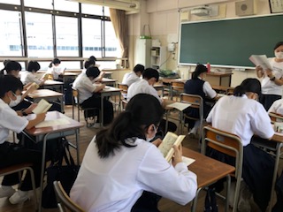 1年生の登校後の様子です。手を洗って教室に入り、朝の学活をしています。だんだんと中学校の生活にも慣れてきました。小学校では45分の授業が中学校では50分になっていますが、生徒たちは3時間(コマ)の授業ということもあり、集中しています。