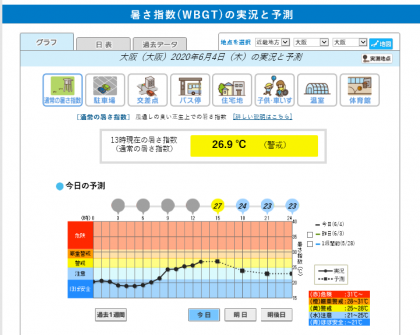 環境省が算出した大阪の暑さ指数において、9時現在「厳重警戒」又は「危険」の予報が出されました。