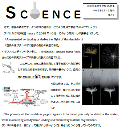 「理科通信Science3」を配布しました。紙面では「タンポポの種子とカエデには、空気の渦を利用して種子を遠くへ飛ばそうとするはたらきがあり、飛行機の翼のように空気の流れを利用した揚力を利用している」ことなどが紹介されています。また、生徒のスケッチも紹介されています(こちらをクリックすれば、カラーでご覧いただけます)。