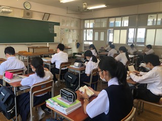 朝学活のあと、朝読書の時間を過ごしています。1限の予習をしている様子も伺えました。
