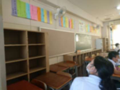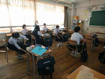 休み時間には、ソーシャルディスタンスを意識して友だちとも過ごしています。教室内の掲示も生徒たちの作品で賑わってきました!