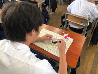 本日の給食は、牛乳、パンプキンパン、ぶどうゼリーになっています。冷たいゼリーがおいしいですね。