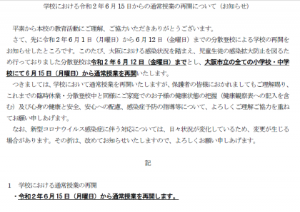 さて、先に令和2年6月1日(月曜日)から6月12日(金曜日)までの分散登校による学校の再開をお知らせしたところです。このたび、大阪における感染状況を踏まえ、児童生徒の感染拡大防止を図るため行っておりました分散登校は令和2年6月12日(金曜日)までとし、大阪市立の全ての小学校・中学校にて6月15日(月曜日)から通常授業を再開いたします。