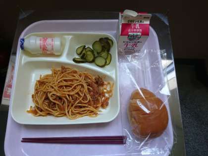 1/2パン、牛乳、発酵乳、スパゲティミートソース、きゅうりのピクルス