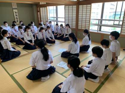 本日は7名の1年生が茶道部の体験に参加しています。二手に分かれて、お手前の作法を見学しています。