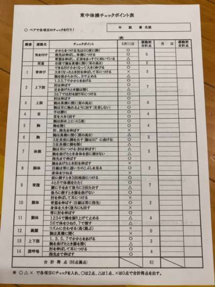 次回はテストを行います。東中体操のマスターをめざして、頑張れ2年生!